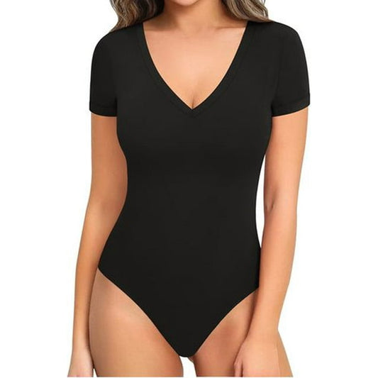 2 Pack Body Suit Tummy Control Bodysuit Deep V Neck Short Sleeve Tops Black Bodysuits for Women (Black+White)