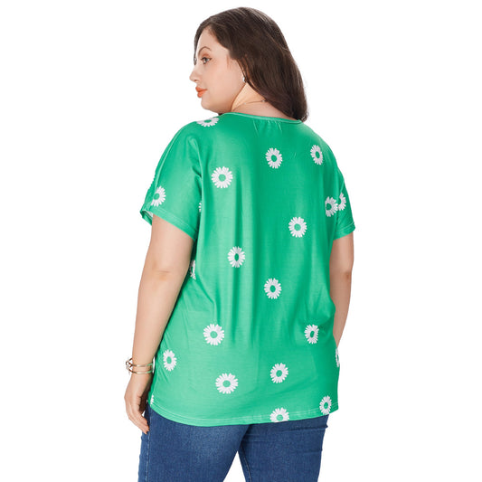 2025 Women's Plus Size Top Flower Printed V Neck Short Sleeve Casual Plus Size Tops for Women