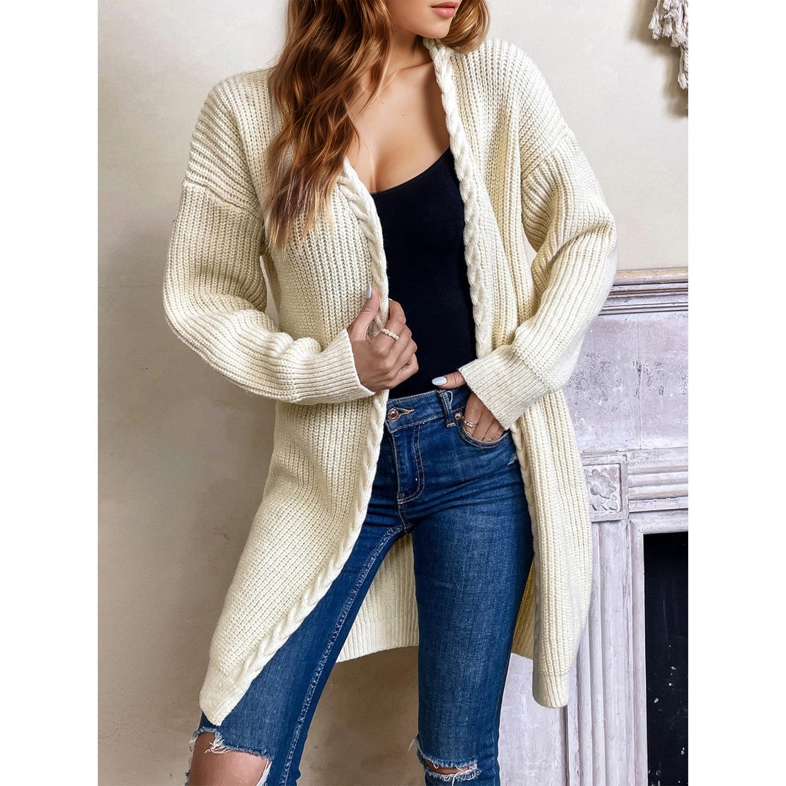 Womens Long Cardigan Sweaters Open Front White Chunky Cable Knit Duster Drop Shoulder Comfy Cardigan